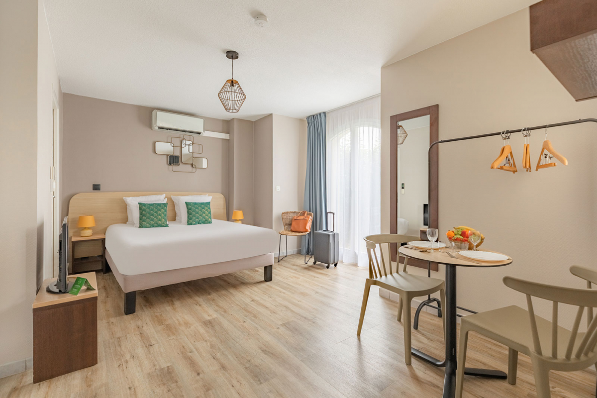 Erleben Sie einen völlig unabhängigen Aufenthalt in der Nähe von Toulouse in den klimatisierten Unterkünften Ihres Appart'City, die sich in Studios für 2 Personen, 2-Zimmer-Apartments für 4 Personen und 3-Zimmer-Apartments für Familien mit bis zu 6 Personen aufteilen. Komfortabel eingerichtet und so gestaltet, als wären Sie zu Hause, finden Sie eine ungleichmäßig ausgestattete Küche, in der Sie Ihre selbstgemachten Gerichte zaubern können, mit Cerankochfeld, Kühlschrank, Mikrowelle und Kaffeemaschine. Die geräumigeren Apartments verfügen zusätzlich über einen Geschirrspüler und bestehen aus einem Wohnbereich mit Schlafsofa.