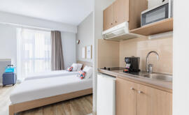 Keine Lust zu kochen? Entdecken Sie unser Essensangebot Comptoir City: ein Schnellrestaurant, in dem Ihnen Snacks und Zwischenmahlzeiten zum Mitnehmen serviert werden. Sie können auch leckere, vor Ort hergestellte Pizzen bestellen, die Sie in Ihrem Studio oder Apartment genießen können.