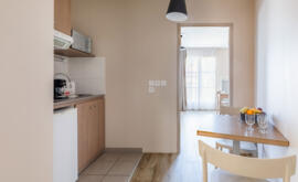 Leben Sie völlig unabhängig in Unterkünften mit 3-Sterne-Komfort. Es ist an alles gedacht, damit es Ihnen an nichts fehlt. Die Studios und Zwei- bis Dreizimmerwohnungen bieten Platz für maximal 4 Personen, verfügen über eine optimale Raumaufteilung und sind sorgfältig dekoriert. Wie zu Hause steht Ihnen eine voll ausgestattete Küche mit Kochplatten, Kühlschrank und Geschirrset zur Verfügung. Die Apartments verfügen außerdem über einen Wohnbereich mit Schlafsofa und einen Geschirrspüler.
