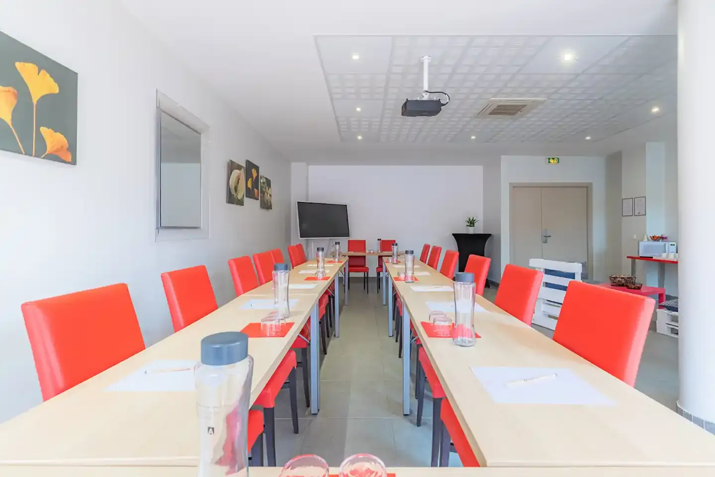 Organisieren Sie Ihre Seminare, Meetings, Incentives und Schulungen im Aparthotel Bordeaux Saint-Jean-d'Illac und profitieren Sie von einer maßgeschneiderten Leistung. Teilen Sie uns Ihre Bedürfnisse mit und wir managen Ihr Seminar von A bis Z. Versammeln Sie Ihre Gäste in unserem 40 m2 großen, klimatisierten und mit Tageslicht beleuchteten Tagungsraum. Auf Ihren Wunsch stellen wir Ihnen einen Beamer, eine Leinwand und ein Flipchart zur Verfügung. Sie profitieren von einem umfassenden Angebot à la carte. Gönnen Sie sich während Ihres Aufenthalts einen Moment der Entspannung im Außenpool des Aparthotels. Die Weinberge des Médoc und das Becken von Arcachon bieten Ausflugsmöglichkeiten. In 30 Minuten erreichen Sie das Stadtzentrum von Bordeaux, sein denkmalgeschütztes historisches Viertel und seine Feinschmeckeradressen.
