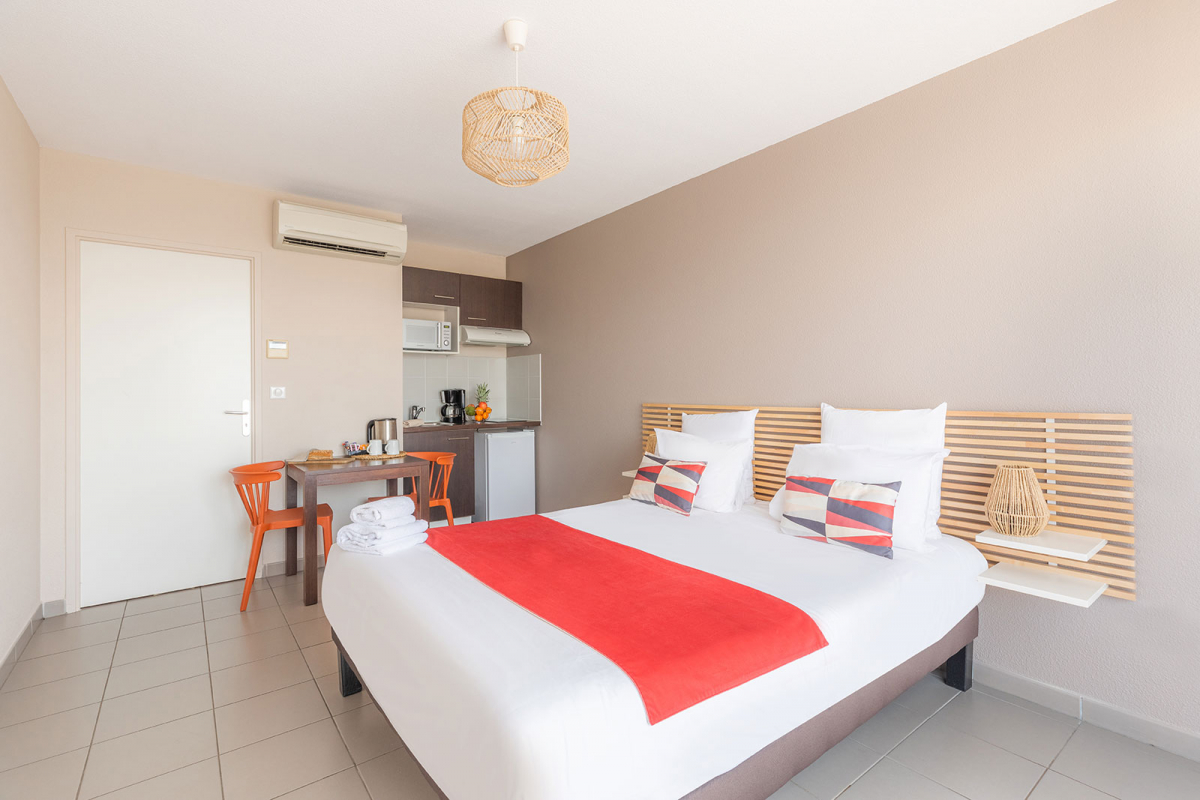 Fully furnished and decorated with care, accommodation ranges from functional studios for 2 people to 3-room family apartments for up to 8 people. All feature a fully-equipped kitchen, quality bedding, an office area and reversible air conditioning. The apartments feature a spacious living area with convertible sofa.