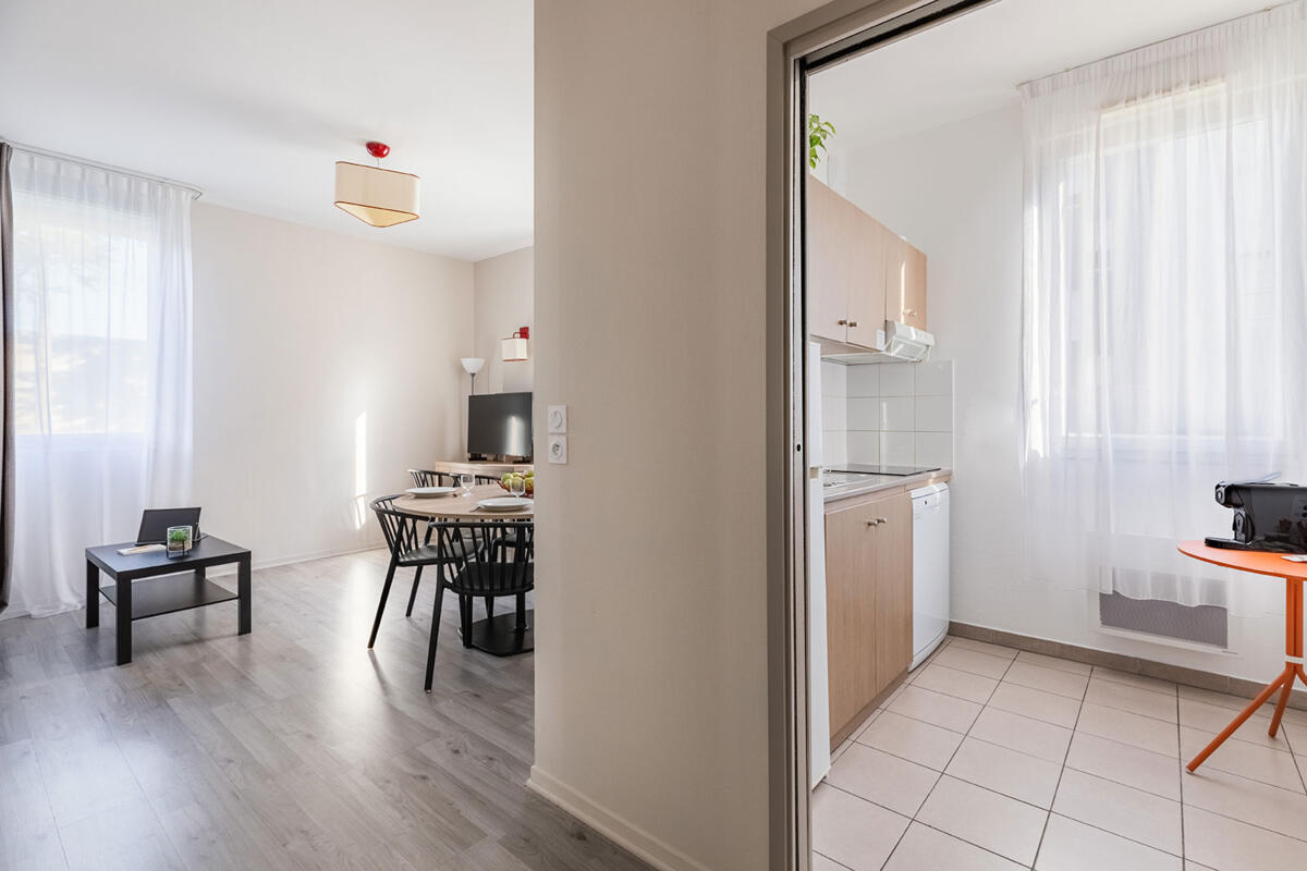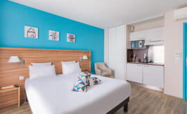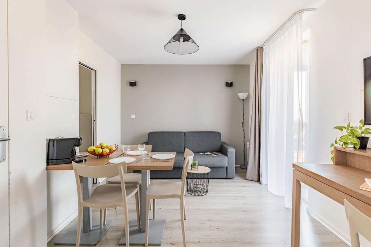The comfortable, self-contained apartments in your Saint-Nazaire Océan appart-hotel are divided into optimized studios for 2 people, 2-room apartments for 4 people, and 3-room "family" apartments for up to 6 people. You'll enjoy a relaxing stay in complete autonomy, thanks to a fully-equipped kitchen with ceramic hob, fridge, microwave, coffee maker, extractor hood, crockery and kitchen utensils. The apartments also feature a living room with sofa bed and dishwasher.
