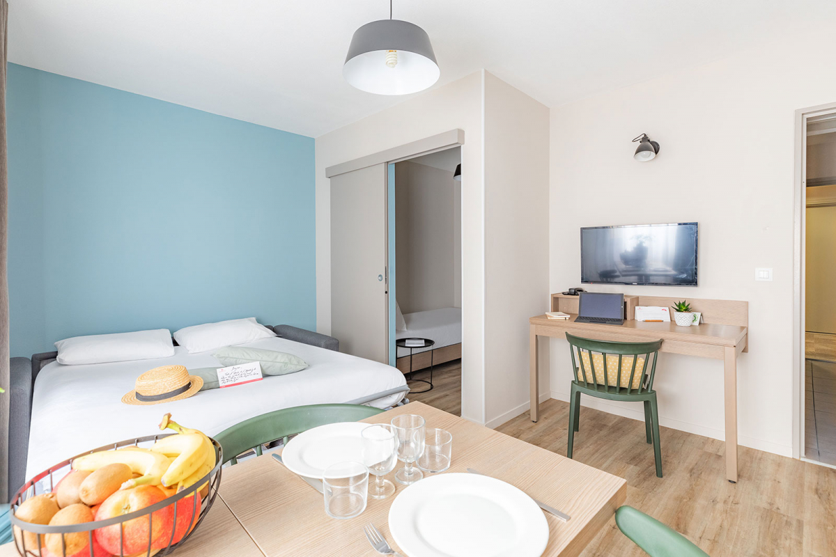 Choose the apartment that's just right for you. Choose from studios for 2 to 3 people, 2-room apartments for 4 people, or spacious 3-room apartments for families accommodating up to 6 people. Comfortably furnished, you'll find a sleeping area with high-quality bedding, a work area and a ready-to-use kitchen with ceramic hob, fridge, microwave, coffee maker or kettle and dishwasher.