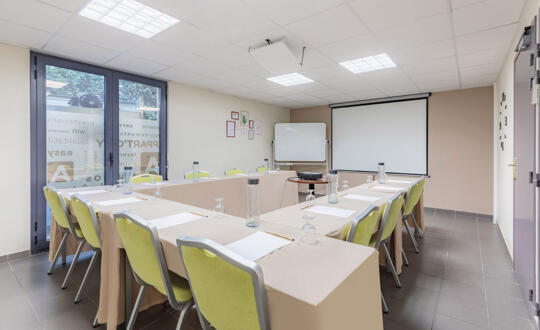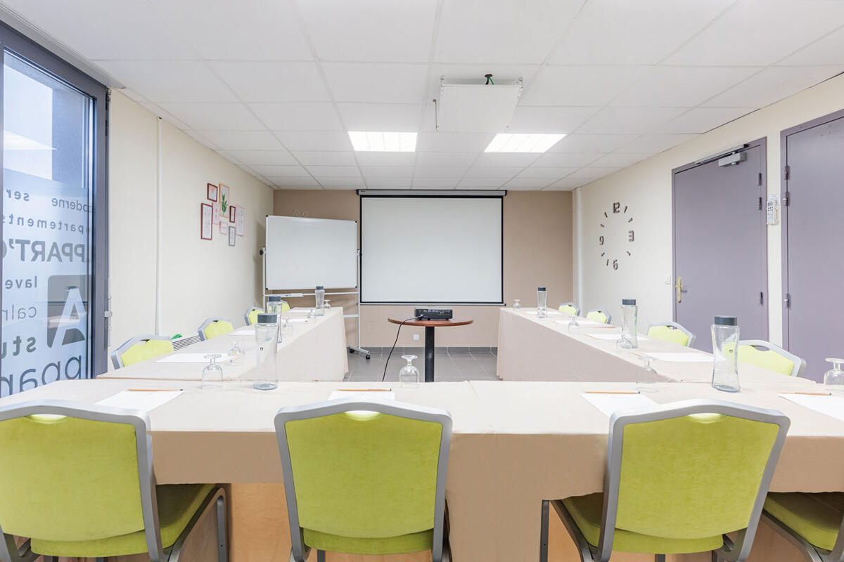 Su aparthotel Montélimar le ofrece un paquete de seminarios que puede personalizar según sus necesidades. Organice sus eventos de empresa, reuniones, conferencias o incentivos de la A a la Z, con una sala de reuniones de 35 m² adaptable para acoger hasta 25 invitados. Agradable y luminosa, también puede equiparse con un proyector de vídeo, una pantalla y un rotafolio digital disponibles previa petición. Para una experiencia completa, añada alojamiento y catering adaptados a sus necesidades profesionales. Descubra nuestra oferta de seminaries