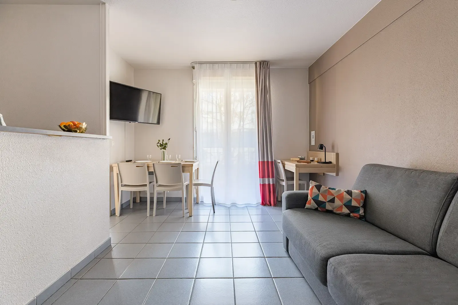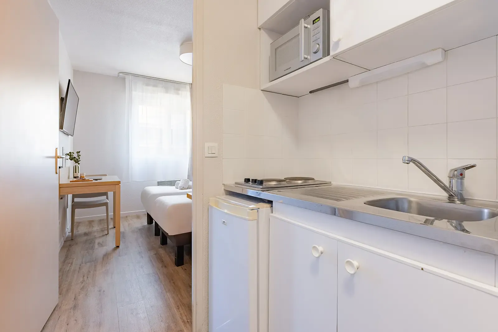 Votre studio ou appartement 2 pièces vous accueille dans un cadre sobre, soigné et fonctionnel, pour un séjour lyonnais en toute autonomie. Seul, à deux ou pour une famille de 4 personnes, vous profiterez d’un logement confortable et d’une cuisine toute équipée avec plaques de cuisson électriques, réfrigérateur, micro-ondes, cafetière ou bouilloire. Cet appart’hôtel n’est pas équipé de climatisation.