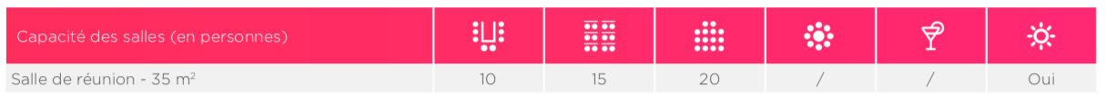 | Salle de réunion - 35m² | 10 | 15 | 20 | - | - |